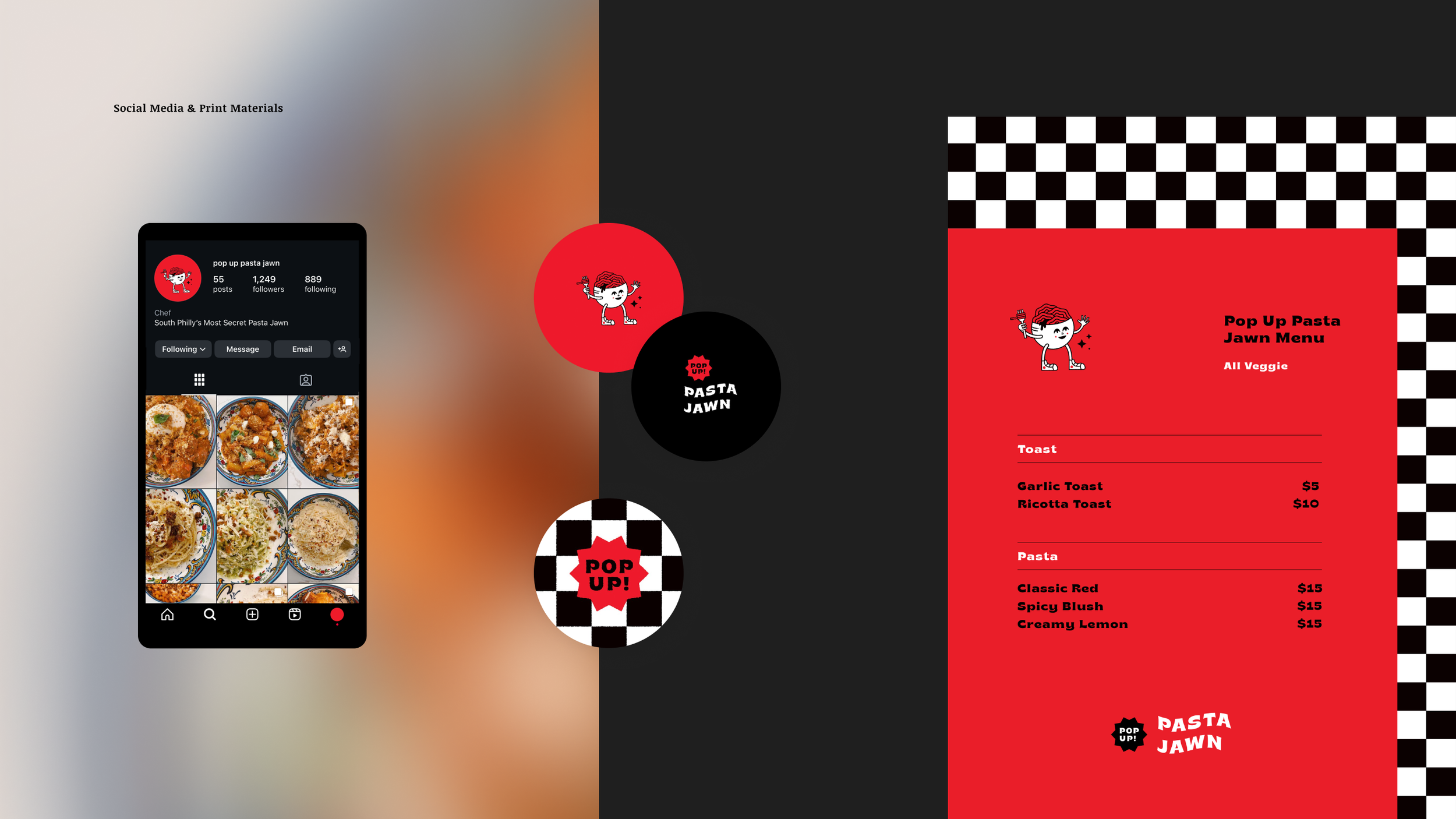Pop-Up Pasta Jawn is a top-secret pasta pop-up located in South Philly. The objective for the Pop-Up Pasta Jawn brand was to create an eye-catching logo that would stand out and generate buzz for their tasty pasta creations. I designed a slightly unhinged pasta brain-eating character that served as the brand mascot. This character, combined with a vibrant color palette and retro checkered pattern, resulted in a brand identity that feels distinctly aligned with the brand's voice and aesthetic.